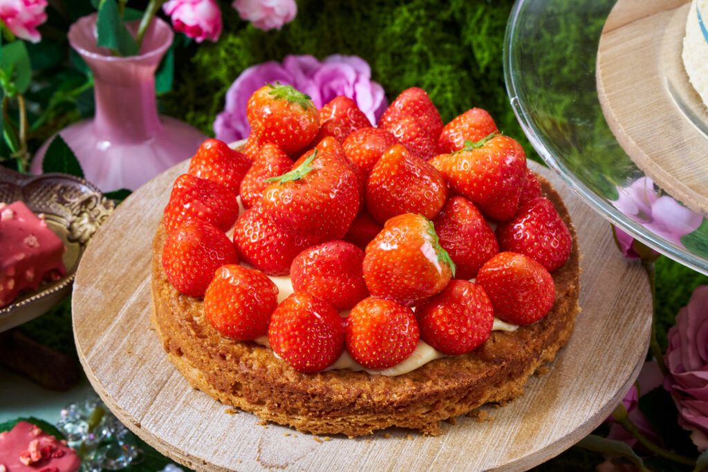 なかでも注目のスイーツは、県産いちごをふんだんにスライスし、ドレスのように華やかにあしらったショートケーキ。ふんわり焼き上げたスポンジには、素材の風味を生かしたやさしい味わいを閉じ込めました。さらに、しっとりとしたクレープ生地を重ねることで、食感に優雅なアクセントをプラス。